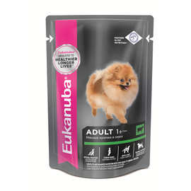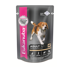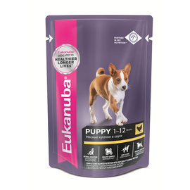 Влажный корм продается в удобных паучах по 85 грамм (для щенков) и по 100 грамм (для взрослых особей).
