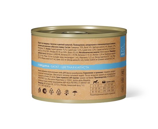 Говядина (70%), Батат (4%), Цветная капуста (4%), Бульон (17%), Минералы (5%).
