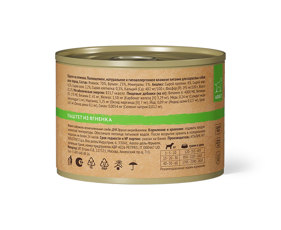 Ягненок (70%), Бульон (25%), Минералы (5%).