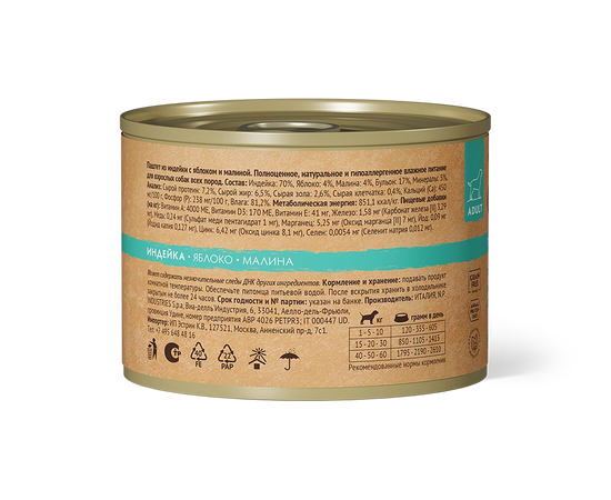 Индейка (70%), Яблоки (4%), Малина (4%), Бульон (17%), Минералы (5%).