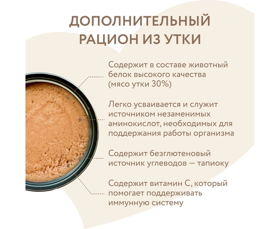Содержит в составе животный белок высокого качества (мясо утки 30%), который легко усваивается, богат животным жиром и служит источником незаменимых аминокислот, необходимых для поддержания работы всех жизненно важных органов и систем организма, тапиоку – безглютеновый источник углеводов, а также витамин С, который помогает поддерживать иммунную систему.