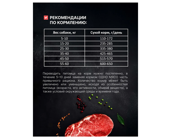 переводить питомца на корм нужно постепенно, в течение 5–10 дней заменяя кормом ОДНО МЯСО часть привычного рациона. Количество корма может быть увеличено или уменьшено, исходя из особенностей питомца (возраста, его активности, обмена веществ), а также условий окружающей среды и времени года. Условия хранения: хранить в сухом, защищённом от солнечных лучей месте.