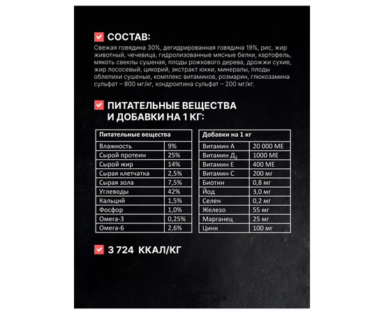 свежая говядина 30%, дегидрированная говядина 19%, рис, жир животный, чечевица, гидролизованные мясные белки, картофель, мякоть свеклы сушеная, плоды рожкового дерева, дрожжи сухие, жир лососевый, цикорий, экстракт юкки, минералы, плоды облепихи сушеные, комплекс витаминов, розмарин, глюкозамина сульфат – 800 мг/кг, хондроитина сульфат – 200 мг/кг.