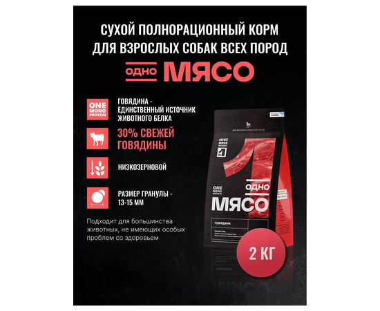Корм ОДНО МЯСО для взрослых собак всех пород с говядиной 2 кг