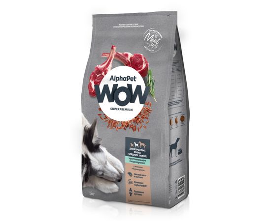 AlphaPet WOW 15кг с ягненком и бурым рисом сухой для взрос собак средних пород с чувст пищев, 652260