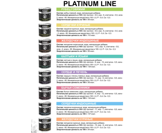 Консервы “Platinum line” подходят для собак всех пород для ежедневного кормления или как дополнение к основному рациону или вкусное угощение питомца. Помимо этого данные корма подходят для питомцев, которым показана строгая или монобелковая диета в связи с аллергией или проблемами чувствительного пищеварения.