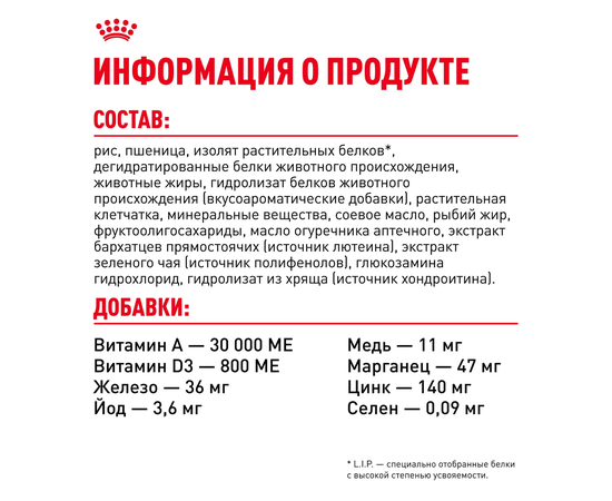 Рис, пшеница, изолят растительных белков*, дегидратированные белки животного происхождения (птица), животные жиры, гидролизат белков животного происхождения (вкусоароматические добавки), растительная клетчатка, минеральные вещества, соевое масло, рыбий жир, фруктоолигосахариды, масло огуречника аптечного, экстракт бархатцев прямостоячих (источник лютеина), экстракт зеленого чая (источник полифенолов), гидролизат из панциря ракообразных (источник глюкозамина), гидролизат из хряща (источник хондроитина).