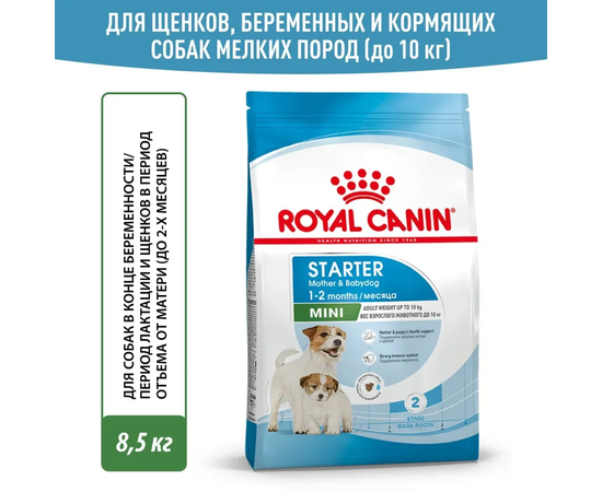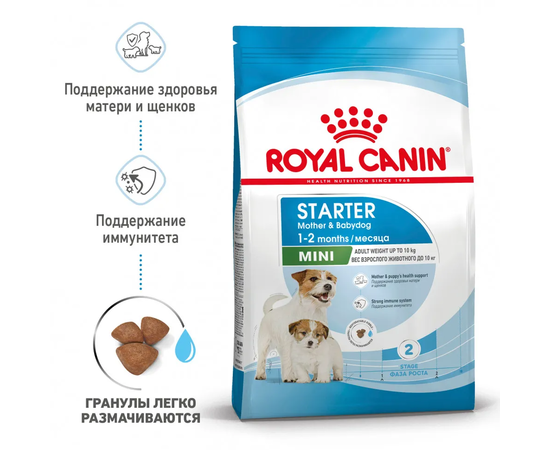 Полнорационный корм для щенков в период отъема до 2-месячного возраста. Также подхожит для сук в последней трети беременности и во время лактации. Продукт современной науки от Royal Canin Mini Starter – это эксклюзивная комбинация питательных веществ, имеющихся в молоке матери, усиленная дополнительными веществами, которые активно способствуют безопасности пищеварения и укрепляют естественный иммунитет щенков. Диетологическое решение, адаптированное к высоким потребностям суки в конце периода беременности и во время лактации. Диетологическое решение, которое облегчает перевод щенка с молока матери на твердый корм (энергетическая ценность, качество белка, жиры). Крокеты легко размачиваются до консистенции каши и обладают высокой вкусовой привлекательностью для суки и щенков в период отъема.