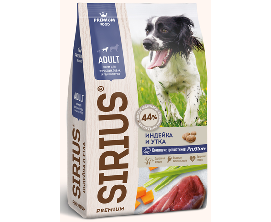 SIRIUS — сухой корм премиум класса для полноценного ежедневного рациона взрослых собак средних пород. Высокое содержание мясных ингредиентов обеспечивает оптимальный уровень белка и укрепляет мышцы. Баланс витаминов и комплекса пробиотиков 4-го поколения PROSTOR+ нормализует пищеварение и укрепляет иммунитет. Омега 3 и Омега 6 способствуют поддержанию здоровья сердца, мозга, нервной системы, здоровья кожи и красоты шерсти.