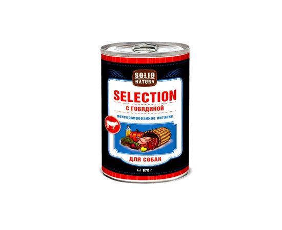 Solid Natura Selection с говядиной - консервированное влажное полнорационное питание для собак. Не содержит сои, ароматизаторов, ГМО. Одновременное применение данных качеств создаёт синергетический эффект. Изготовлено в России из лучших сортов отечественного мяса и птицы.