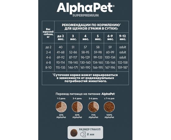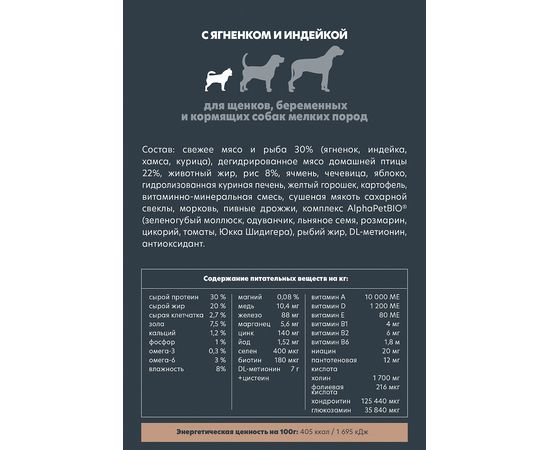 Собачий корм АльфаПет Суперпремиум содержит в составе 80% качественного мясного белка с мощным аминокислотным профилем. Зоотовары для собак обеспечивают оптимальный баланс кальция, фосфора и витамина Д для правильного формирования скелета щенка. Корм для собак сухой для мелких пород позволяет получить необходимый уровень высокоусвояемого белка. Премиум корма содержат витамины, микроэлементы и минеральные вещества, а также комплекс трав и экстрактов AlphapetBIO.