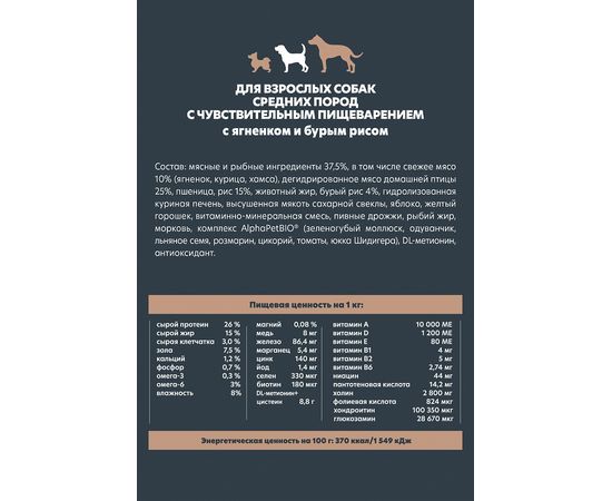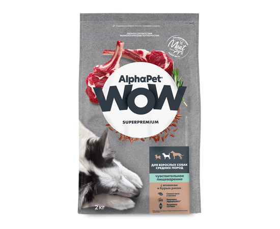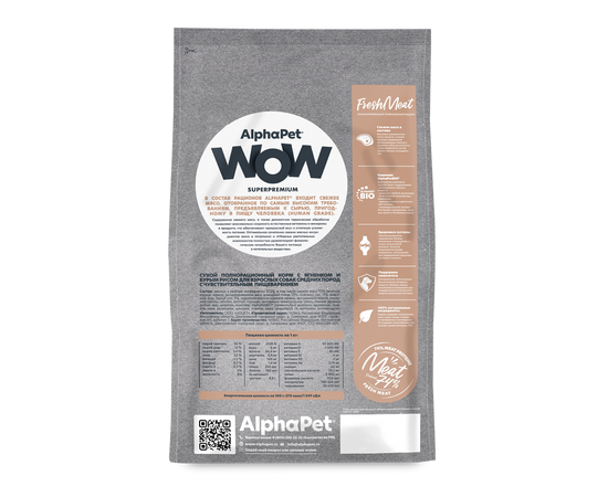 AlphaPet WOW для взрослых собак средних пород с чувств. пищ. ягненок с бурым рисом сухой 15кг, 652260