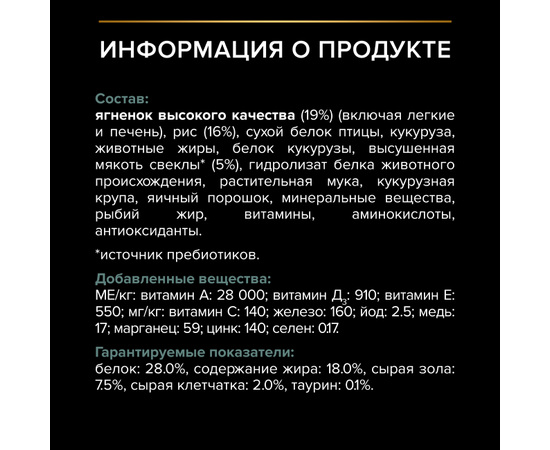 Ягненок (19%), кукуруза, сухой белок птицы, рис (8%), животный жир, кукурузный глютен, кукурузная крупа, сухая мякоть свеклы, вкусоароматическая кормовая добавка, продукты переработки растительного сырья, яичный порошок, минеральные вещества, рыбий жир, витамины, аминокислоты, антиоксиданты (токоферолы природного происхождения).