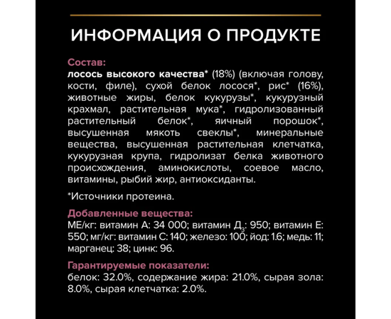 лосось* (18%), сухой белок лосося*, рис* (16%), животный жир, кукурузный глютен*, кукурузный крахмал, продукты переработки растительного сырья*, сухой соевый белок*, вкусоароматическая кормовая добавка, сухая мякоть свеклы*, минеральные вещества, кукурузная крупа, целлюлоза, соевое масло, яичный порошок*, витамины,рыбий жир, антиоксиданты (токоферолы природного происхождения)*.