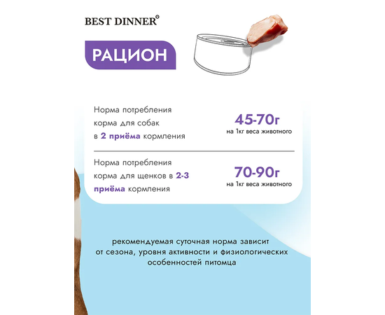 Суточная норма: Норма потребления корма для собак 40-70 г и щенков 60-80 г на кг веса животного в 2-3 приема кормления.