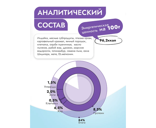 Состав: Индейка, мясные субпродукты, плазма крови, картофельный крахмал, яичный порошок, клетчатка, отруби пшеничные, масло льняное, рыбий жир, дрожжи, морские водоросли, топинамбур, семена льна, юкка Шидигера, желирующая добавка, DL-метионин.
