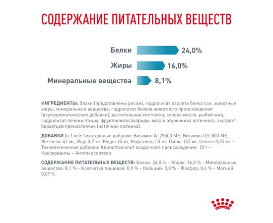 Злаки, гидролизат изолята белка сои, животные жиры, минеральные вещества, гидролизат белков животного происхождения (вкусоароматические добавки), растительная клетчатка, соевое масло, рыбий жир, гидролизат печени птицы, фруктоолигосахариды, масло огуречника аптечного, экстракт бархатцев прямостоячих (источник лютеина).