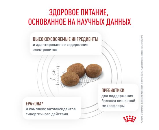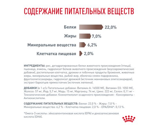 Рис, дегидратированные белки животного происхождения (птица), пшеница, ячмень, гидролизат белков животного происхождения, свекольный жом, дрожжи, животные жиры, минеральные вещества, фруктоолигосахариды, оболочка и семена подорожника, рыбий жир, гидролизат дрожжей (источник мaннановых олигосахаридов), экстракт бархатцев прямостоячих (источник лютеина).