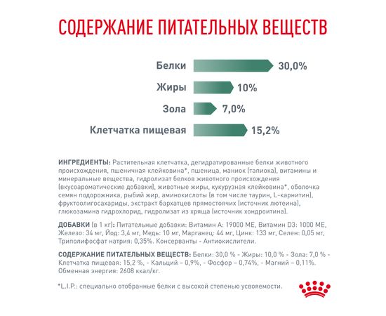 ИНГРЕДИЕНТЫ: дегидратированные белки животного происхождения (птица), растительная клетчатка, пшеничная клейковина*, тапиока, экстракт цикория, гидролизат белков животного происхождения (вкусоароматические добавки), кукурузная клейковина, пшеница, кукуруза, животные жиры, минеральные вещества, оболочка и семена подорожника, рыбий жир, соль жирной кислоты, фруктоолигосахариды, гидролизат из панциря ракообразных (источник глюкозамина), экстракт бархатцев прямостоячих (источник лютеина), гидролизат из хряща (источник хондроитина).