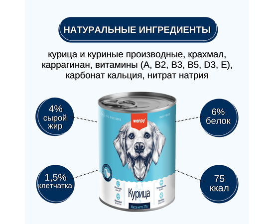 Wanpy Dog консервы для собак из курицы - это высококачественный сбалансированный корм, который обеспечит вашего питомца необходимыми витаминами и минералами.