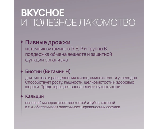 Пивные дрожжи - натуральная пищевая добавка, является источником витаминов (все витамины группы В, а также D, E, P), аминокислот, макро- и микроэлементов, и антиоксидантов. Улучшают здоровье питомца, усиливают защитные функции организма, оптимизируют пищеварение и обменные процессы, поддерживают формирование густой и блестящей шерсти.