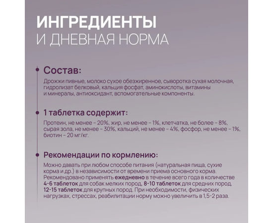Способ применения: рекомендовано применять ежедневно в течение всего года в количестве 4-6 таблеток для собак мелких пород, 8-10 таблеток - для средних пород, 12-15 таблеток - для крупных пород. При необходимости, физических нагрузках, стрессах, реабилитации норму можно увеличить в 1,5-2 раза.