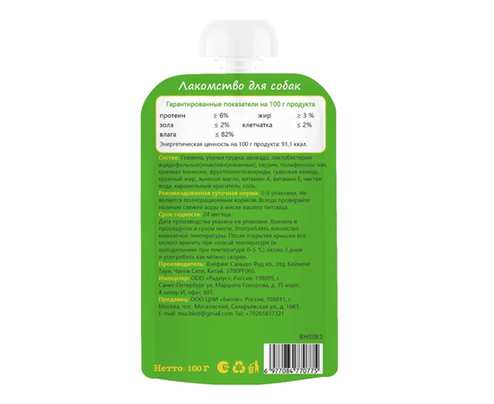 Лакомство для собак Нежное пюре "BIOHAUS" Говядина с уткой и авокадо.