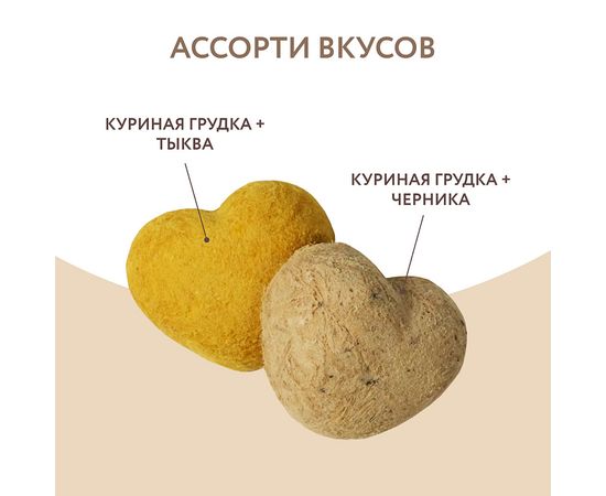 Желтые лакомства: куриная грудка 73%, сухое козье молоко 20%, тыква 5%, витамины (В1,В2,В6, В12,D3, Е).
