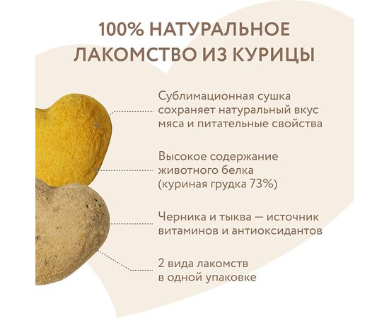 Мнямс" Лакомство "Фросты" из курицы для собак и щенков с 4 месяцев - это сублимированные беззерновые лакомства с высоким содержанием животного белка (куриная грудка 73%), созданные при помощи прогрессивной технологии сушки, которая сохраняет натуральный вкус мяса и питательные свойства ингредиентов. Черника и тыква в составе богаты витаминами и антиоксидантами, которые улучшают обмент веществ. Одна упаковка "Фростов" содержит лакомства двух видов: из курицы с черникой и из курицы с тыквой, которые подходят для питомцев всех пород.