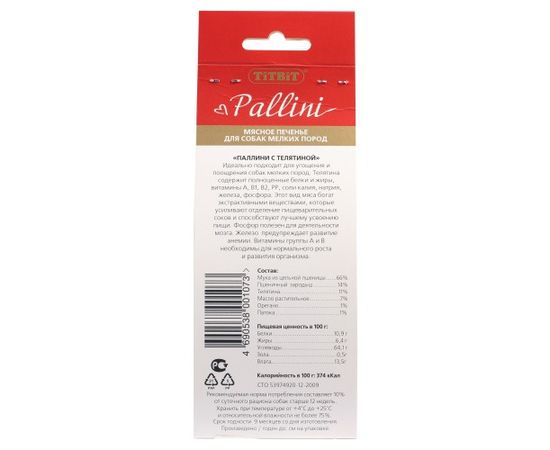 ЛАКОМСТВО "TITBIT" Д/СОБАК ПЕЧЕНЬЕ PALLINI С ТЕЛЯТИНОЙ 125гр 1073, 580211