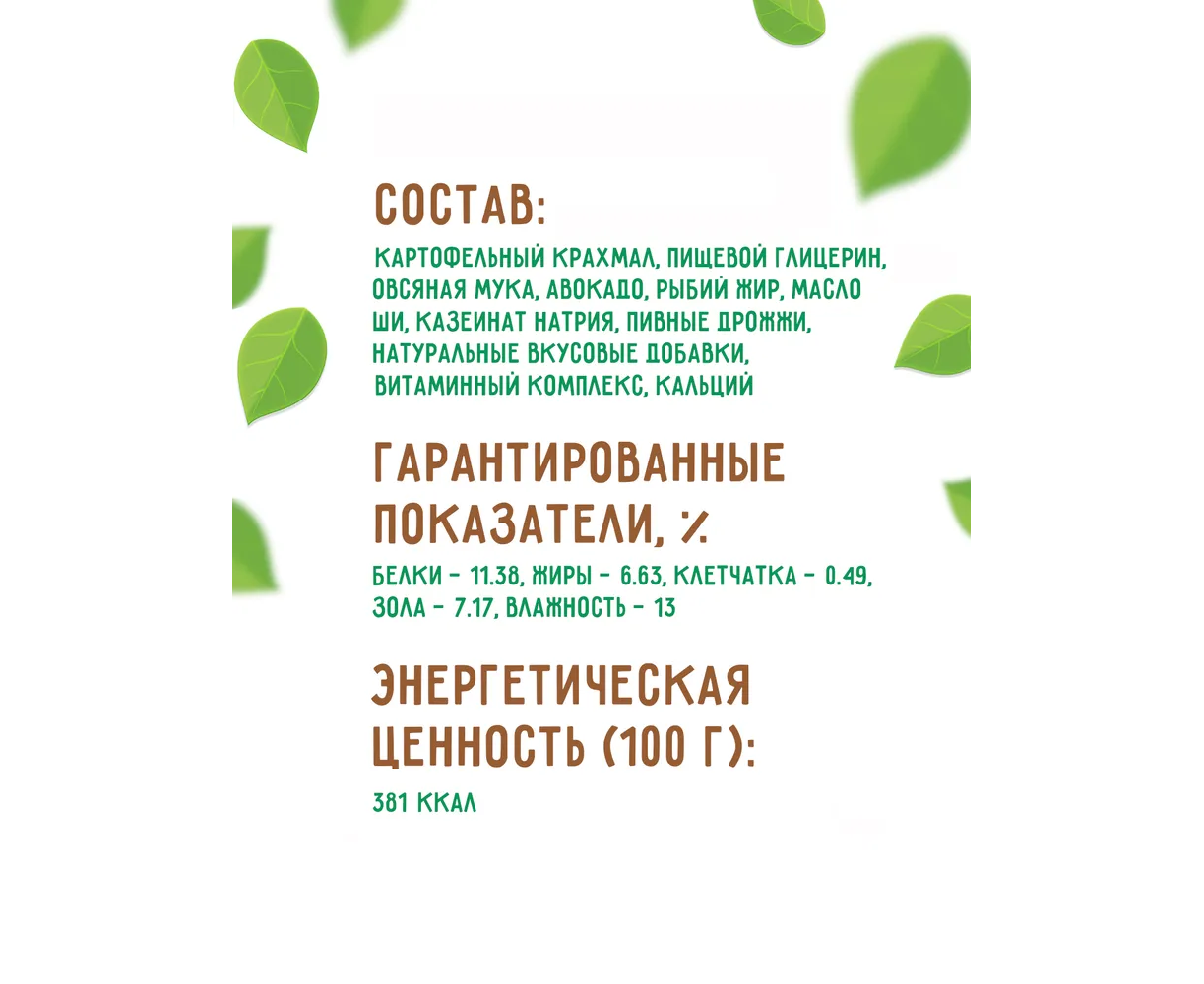Картофельный крахмал, пищевой глицерин, овсяная мука, авокадо, рыбий жир, масло ши, казеинат натрия, пивные дрожжи, натуральные вкусовые добавки, витаминный комплекс, кальций.