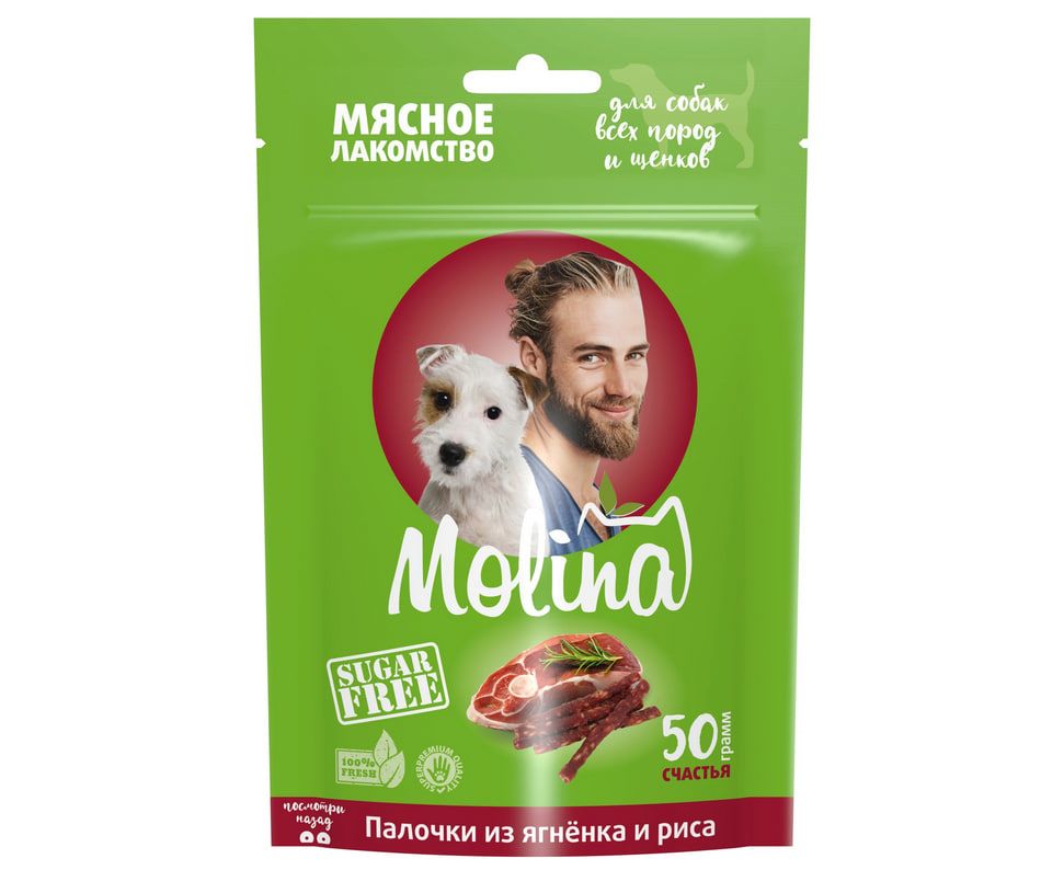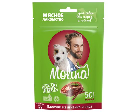 MOLINA Палочки из ягнёнка и риса — гипоаллергенное лакомство для собак всех пород и щенков. Натуральные палочки с мясом ягнёнка и рисом подарят питомцу вкусное удовольствие и удовлетворят естественный жевательный инстинкт.
