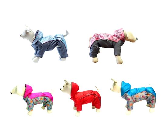 Комбинезоны на синтепоне для собак мелких пород застегиваются на кнопки внизу, пах открыт, имеется капюшон, внутренняя утепленная часть представляет собой подкладку на синтепоне.