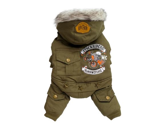 Теплый комбинезон для питомца от бренда "Уют" в цвете хаки — это идеальный выбор для любителей практичного и стильного решения. Выполненный в армейском стиле с кармашками и принтом, этот комбинезон подчеркнет индивидуальность вашего питомца и добавит мужественности его образу. Меховой капюшон не только придает дополнительный шарм, но и защищает от ветра и холода, обеспечивая комфорт во время прогулок.