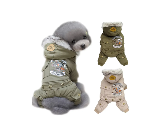 Комбинезон легко надевается, что делает его удобным для повседневного использования и активного отдыха на свежем воздухе. Он подходит для холодной погоды, надежно защищая вашего питомца от непогоды и поддерживая тепло даже в самые прохладные дни.