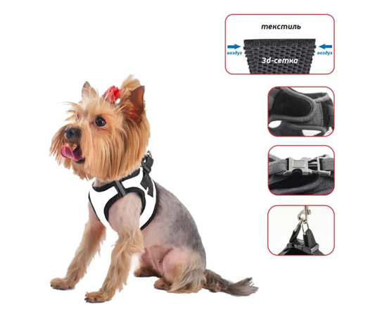 Шлейка текстильная 3х-слойная №10 ZooM серия "Домино", экокожа бел.+3D сетка+светоотражающая на обхват груди 62,67см