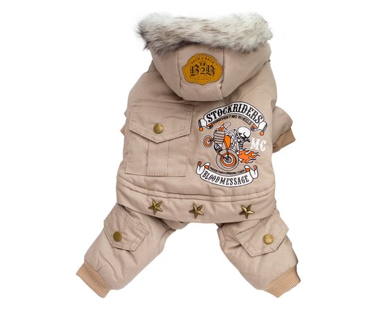Комбинезон оснащен меховым капюшоном, который не только защищает от холода, но и придает вашему питомцу стильный вид. Благодаря своей конструкции, он легко надевается, что делает его идеальным выбором для занятых владельцев. Убедитесь, что ваш питомец всегда готов к приключениям на свежем воздухе!