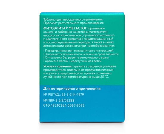 ФИТОЭЛИТА® МЕТАСТОП применяют до и послеоперационный период в качестве антиметастатического, антитоксического, противоопухолевого и адаптогенного средства, а также для детоксикации организма при новообразованиях у кошек и собак.