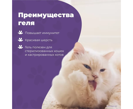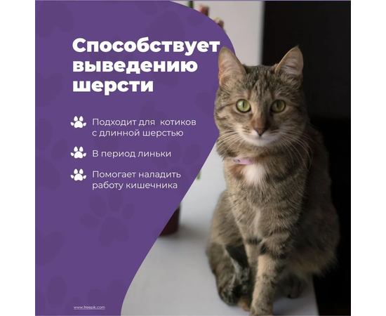 · Выводит шерсть и улучшает работу кишечника: помогает избежать проблем с пищеварением и непроходимости кишечника.