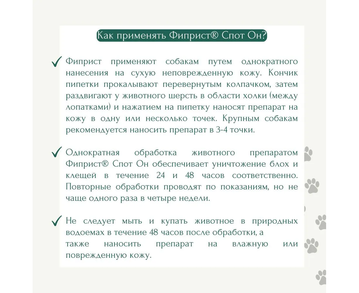 Если вес собаки более 60 кг, то для обработки следует использовать 2 пипетки, предназначенные для собак от 20 до 40 кг. Защитное действие препарата против клещей составляет 1 месяц (для кошек 15-21 день), против насекомых — 2-2,5 месяца (для кошек 1,5 месяца). Для лечения отодектоза (ушной чесотки) у животных слуховой проход очищают от корочек и струпьев сухим способом, без использования специальных гигиенических средств и лосьонов для ушей. Препарат закапывают в оба уха по 4-6 капель, даже в случае поражения только одного уха. Для равномерного распределения препарата ушную раковину складывают пополам и слегка массируют ее основание, а остаток лекарственного средства можно нанести на кожу между лопаток. Обработку проводят однократно. В запущенных случаях отодектоза, осложненных отитами, назначают антибактериальные и противовоспалительные средства. Препарат можно применять у беременных и кормящих самок. Мыть животных шампунем или купаться в природных водоемах разрешается не ранее 2 суток после обработки. ПОБОЧНЫЕ ДЕЙСТВИЯ У гиперчувствительных животных в редких случаях возможны аллергические реакции. В таких случаях применение препарата прекращают, а остатки его на коже удаляют при помощи ватного тампона и промывают водой, при необходимости назначается десенсибилизирующая терапия. ПРОТИВОПОКАЗАНИЯ Повышенная индивидуальная чувствительность к компонентам препарата. Не подлежат обработке щенки и котята моложе 8-недельного возраста, ослабленные и больные животные. Для лечения отодектоза в случаях прободения барабанной перепонки применять препарат запрещается. ОСОБЫЕ УКАЗАНИЯ При проведении манипуляций с препаратом запрещается пить, курить и принимать пищу. При случайном попадании средства на кожу или слизистые оболочки его тотчас необходимо смыть струей воды или снять тампоном и затем промыть водой. По окончании обработки руки следует тщательно вымыть теплой водой с мылом. УСЛОВИЯ ХРАНЕНИЯ В сухом, защищенном от света и недоступном для детей и животных месте в упаковке производителя. Отдельно от пищевых продуктов и кормов при температуре от 0 до 25 °С. Срок годности — 3 года.