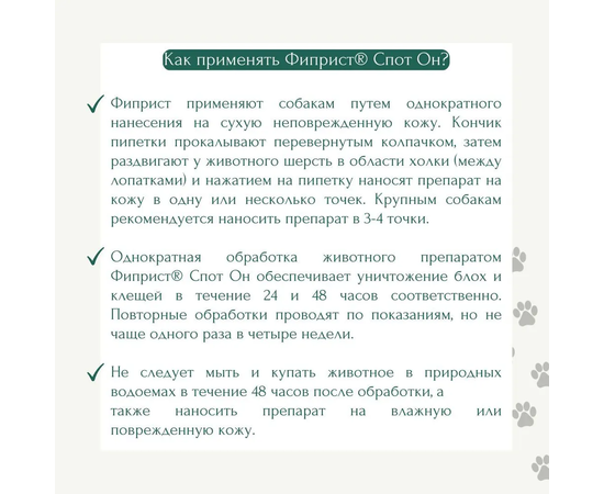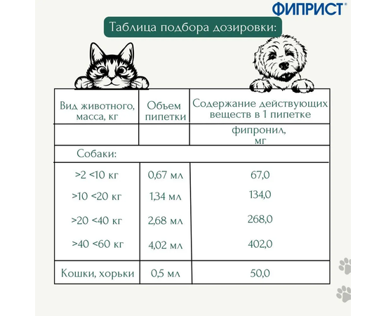 ДОЗЫ И СПОСОБ ПРИМЕНЕНИЯ Фиприст Спот Он применяют наружно и местно путем однократного нанесения на сухую неповрежденную кожу в одной (между лопатками) или нескольких точках в области спины в дозе 1 пипетка на животное. В зависимости от веса для обработки животных используются пипетки с разным количеством препарата: