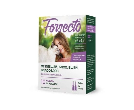 При совместном содержании собак и кошек не следует допускать контакта кошки с обработанной собакой до полного высыхания мест нанесения препарата на собаке. Запрещается применение лекарственного препарата FORSECTO кошкам в период беременности и вскармливания потомства, а также котятам моложе 12-недельного возраста и/или массой менее 2 кг.