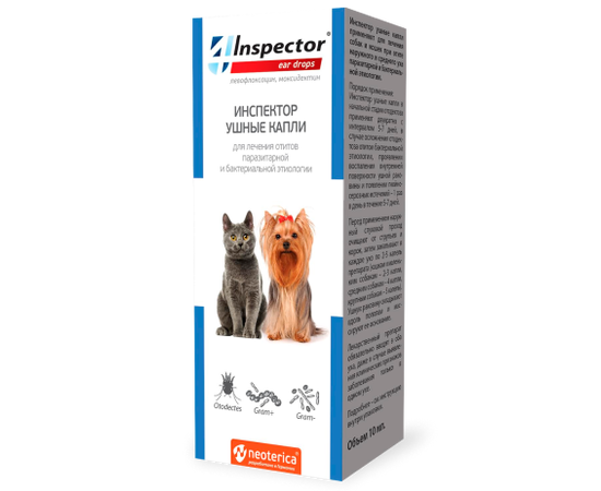 Inspector QUADRO ушные капли применяют для лечения собак и кошек при отите наружного и среднего уха паразитарной и бактериальной этиологии.