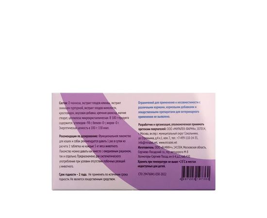 Порядок применения и дозировка:"Функциональное лакомство Милоджик Уро Д-манноза + клюква" для кошек и собак рекомендуется давать 1 раз в сутки из расчета 1 таблетка на каждые 10 кг веса животного. Лакомство можно давать как вместе с ежедневным рационом, так и отдельно. Предназначено для систематического употребления при условии отсутствия побочных реакций у животного.