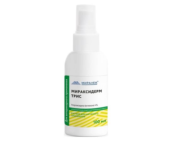 Миракидерм ТРИС антисептический препарат с антибактериальным и фунгицидным действием. Препарат назначают собакам, кошкам и лошадям с лечебно-профилактической целью при бактериальных и грибковых инфекциях кожи, а также как профилактическое или вспомогательное антимикробное лечение при заболеваниях другой этиологии.