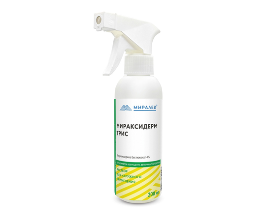 Миракидерм ТРИС антисептический препарат с антибактериальным и фунгицидным действием. Препарат назначают собакам, кошкам и лошадям с лечебно-профилактической целью при бактериальных и грибковых инфекциях кожи, а также как профилактическое или вспомогательное антимикробное лечение при заболеваниях другой этиологии. Прозрачная жидкость от бесцветного до светло-желтого цвета. Ингредиенты: содержит в 1 мл в качестве действующего вещества хлоргексидин – 400 мг, а также вспомогательные вещества: ЭДТА, ТРИС основание ТРИС гидрохлорид, ТВИН 20, 1,3 бутиленгликоль, глицерин и воду очищенную. Препарат применяют 1-2 раза в сутки на протяжении 2-3 дней, далее по мере заживления кожных покровов – 1 раз в сутки. Курс лечения составляет 7-14 дней или по назначению ветеринарного врача. Не рекомендуется применять в случае: аллергических реакций на препарат, индивидуальной непереносимости. Не применять на слизистые оболочки, не допускать использования для обработки полостей тела, слуховых проходов, полостей ран.