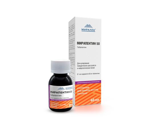 Порядок применения и дозировка: При нейропатических болях в том числе послеоперационных и онкологических доза «Мирапентин 50®️» составляет - для животных массой от 2 до 5 кг 10 мг на килограмм что соответствует 0,2 мл препарата на килограмм веса животного три раза в день -для животных массой более кг 5-7,5 мг/кг (что соответствует 0,15 мл препарата на килограмм веса животного) три раза в день длительность приёма не более 14 дней