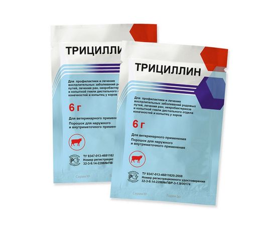 Для лечения некробактериоза и копытной гнили дистального отдела конечностей и копытец в составе комплексной терапии Трициллин наносят в зависимости от площади пораженной поверхности и глубины поражения в количестве 2,5-3 г 2-3 раза с интервалом 72 часа.