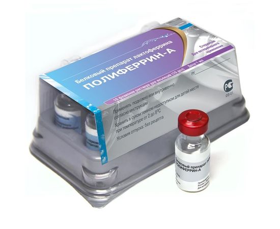 Полиферрин-А, флакон (1 мл/1 доза). Полиферрин-А имеет противоинфекционные, противовоспалительные, иммуномодуляционные, регенерирующие, противовирусные, а также антиоксидантные свойства. Полиферрин-А изготавливается на основе высокоочищенного гликопротеина, который получается из молозива.