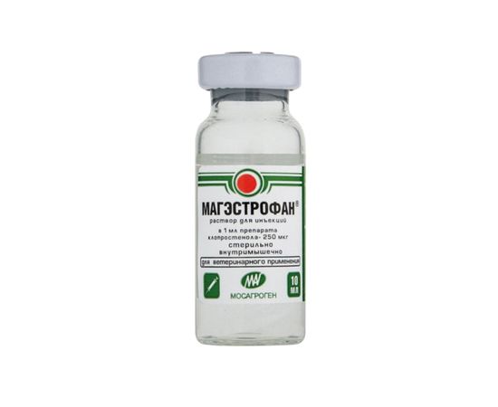 Магэстрофан в 1 мл в качестве действующего вещества содержит клопростенол в виде натриевой соли - 0,25 мг, а в качестве вспомогательных компонентов: нипагин - 0,5 мг, а также воду для инъекций.